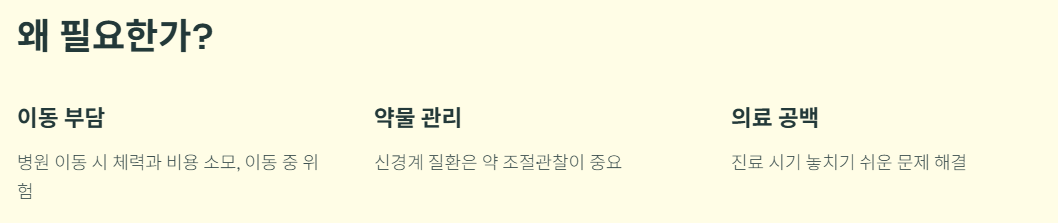 고령 환자는 간병인이 있어도 병원 이동에 체력과 비용이 많이 들고, 이동 중 위험도 있습니다.