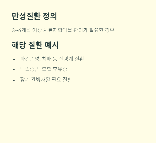 만성질환은 3~6개월 이상 치료·재활·약물 관리가 필요한 경우로 넓게 정의됩니다.