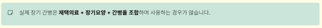 실제 장기 간병은 재택의료 + 장기요양 + 간병을 조합해서 사용하는 경우가 많습니다.