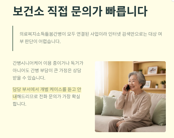 우연히 알게 된 재택의료서비스 공지를 보고 저도 해당되는지 보건소에 문의해볼 작정입니다. 아래 내용 확인하시고, 대상자인지 여부 등이 궁금하시거나 의료서비스 이용하시고 싶으신 분은 아래 내용 확인하셔서 신청해보시기 바랍니다.