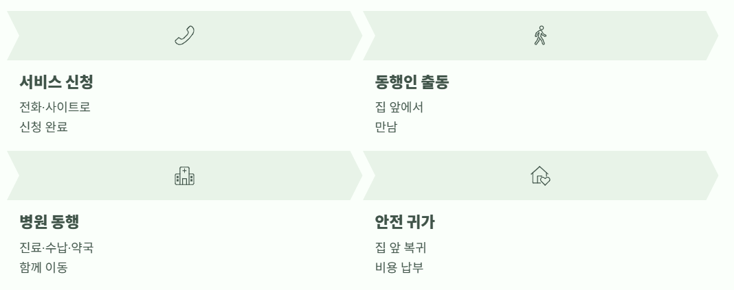 전화 상담을 병행하며 동행 배정 후 일정 확정 → 집 앞에서 출발하는 구조입니다.