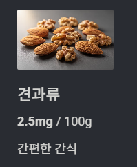 | 견과류(호두, 아몬드) | 2.5mg | 간식으로 섭취 가능, 영양소 풍부 |