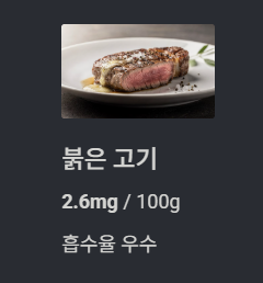| 붉은 고기(소고기) | 2.6mg | 헤모글로빈 생성 도움, 흡수율 높음 |
