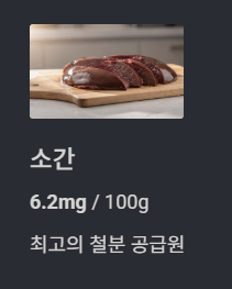 | 소간 | 6.2mg | 동물성 철분 풍부, 빈혈 예방 효과 |