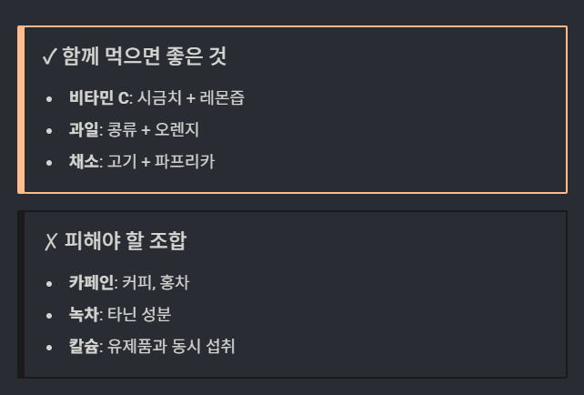 - 비타민 C와 함께 섭취: 시금치+레몬, 콩류+오렌지