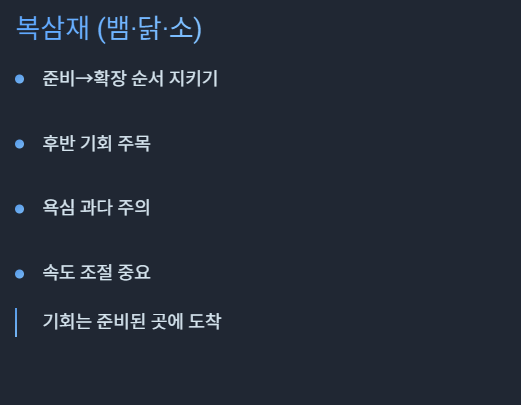 복삼재는 반대로 확장·기회·평가·성과가 붙는 시기이며, 준비가 되어 있을수록 외부 기회와 연결되는 흐름으로 작용합니다.