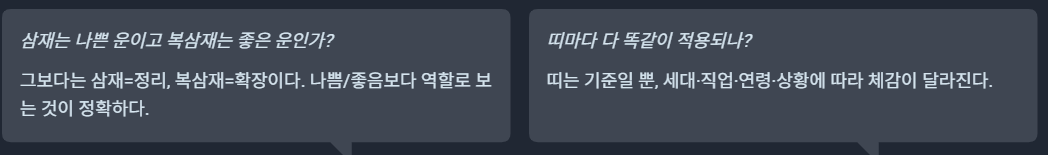 삼재는 방향 조정이 유리하고, 복삼재는 준비했던 것의 반영과 평가가 들어옵니다. 상승과 이동은 복삼재에서 특히 후반부에 붙습니다.