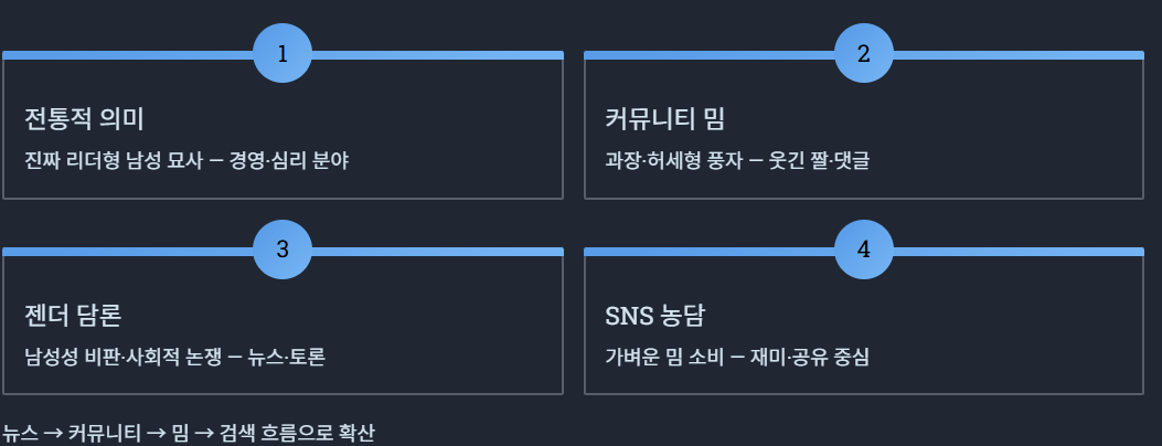 하지만 2020년대 이후에는 밈 + 풍자 + 논쟁 + 남성성 담론이 섞이면서 사용 방식이 크게 달라졌다.