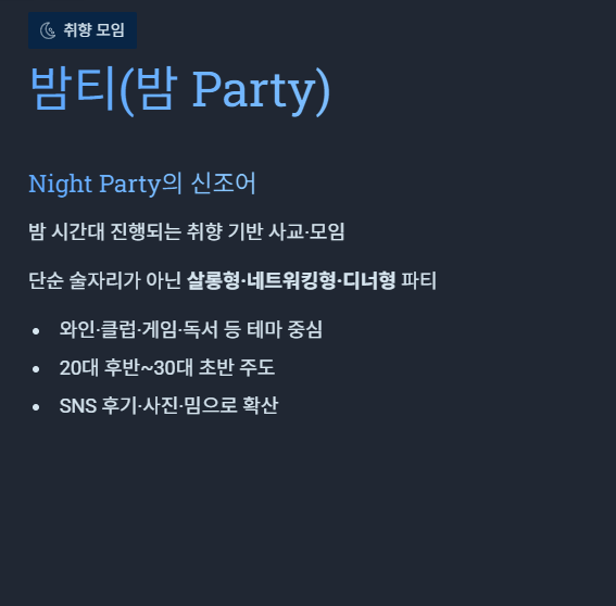 밤티(밤 Party) 뜻|밤에 진행되는 사교·취향·모임 + 후기 + 밈