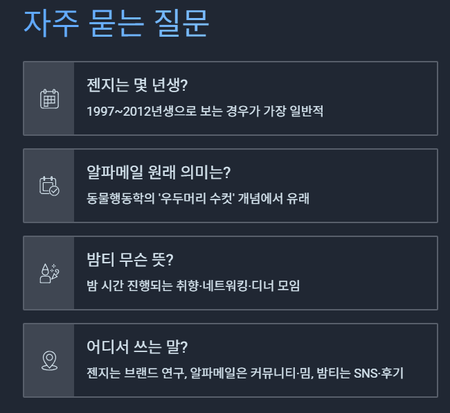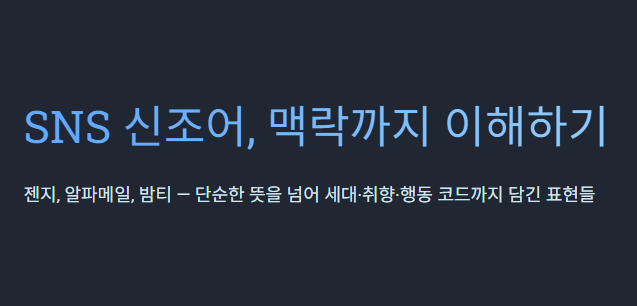 요즘 SNS나 커뮤니티를 보면 처음 듣는 단어가 계속 등장한다. ‘젠지’, ‘알파메일’, ‘밤티’ 같은 단어가 그렇다. 대부분 간단한 뜻을 가진 표현이지만, 세대 감각이나 취향·행동 코드까지 포함되어 있어 맥락을 모르면 대화 흐름을 놓치기 쉽다.