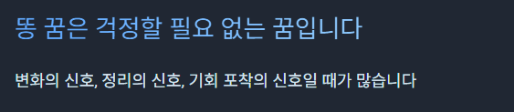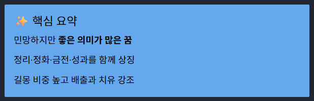 - 설사 꿈 → 빠른 정리·감정 배출·체력 감소 상징입니다.
