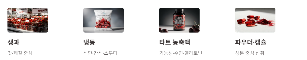 - 타트 체리 : 새콤한 맛, 농축액·주스·파우더·캡슐 형태로 기능성 중심