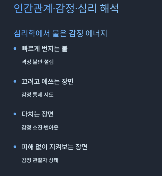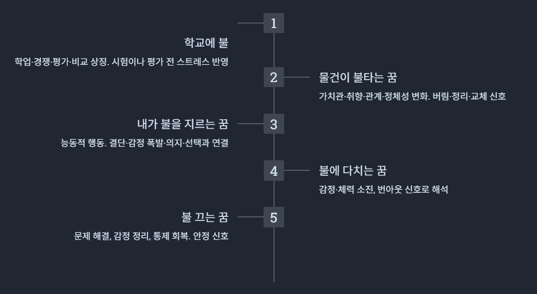 불에 직접 노출되거나 데이는 장면은 감정이나 체력의 소진·번아웃 신호로 해석합니다.