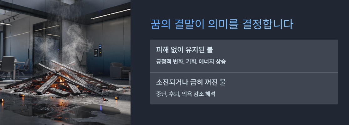 피해 없이 유지된 불은 좋은 의미가 많고, 소진되거나 급히 꺼진 불은 중단·후퇴 해석이 많습니다.