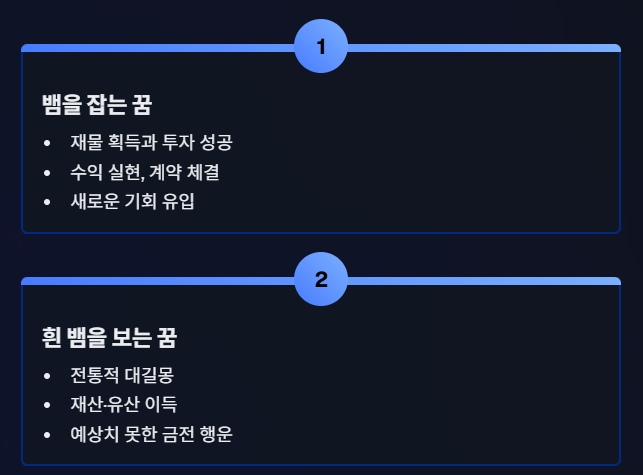 - 재물 획득, 투자 성공, 수익 실현, 계약 체결 등