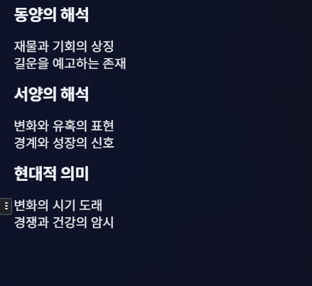 동양권에서는 재물과 기회를 뜻하는 경우가 많았고, 서양권에서는 경계·유혹·변화의 역할이 컸습니다.