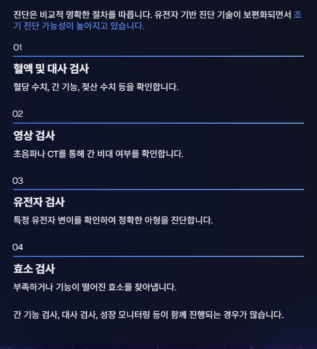 진단 과정에서 간 기능 검사, 대사 검사, 성장 모니터링 등이 함께 진행되는 경우가 많습니다.