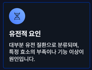 핵심은 에너지 대사 기능 장애이며, 대부분 효소 결함 또는 유전적 요인과 관련됩니다.