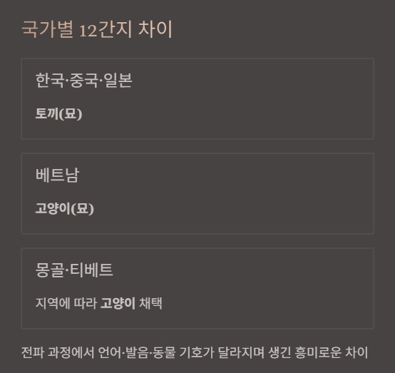 재미있는 점은 국가별 12간지가 다 같지 않다는 점입니다.