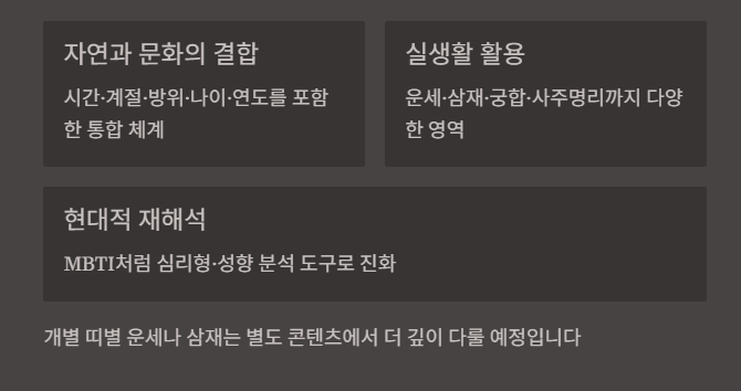 시간·계절·방위·나이·연도·운세·관계성을 모두 포함한 자연·문화 결합 체계입니다.