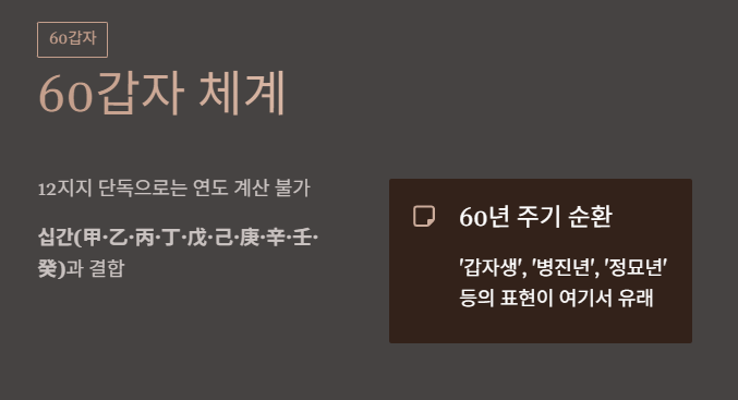 12지지 단독으로 연도 계산이 되지 않기 때문에 십간(갑·을·병…)과 결합해