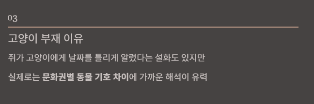 설화에 따라 쥐가 고양이에게 일부러 날짜를 틀리게 알려 고양이가 빠졌다는 이야기도 존재하지만, 실제로는 문화권별 동물 기호 차이에 가까운 해석이 더 유력합니다.