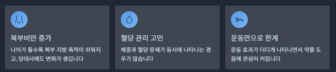 50대 이상에서는 체중 관리뿐 아니라 혈당·복부비만·운동부족 등의 문제와 함께 관심이 더 높아진 상황입니다.