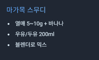 - 방법: 모든 재료를 블렌더에 넣고 갈아서 음료로 섭취
