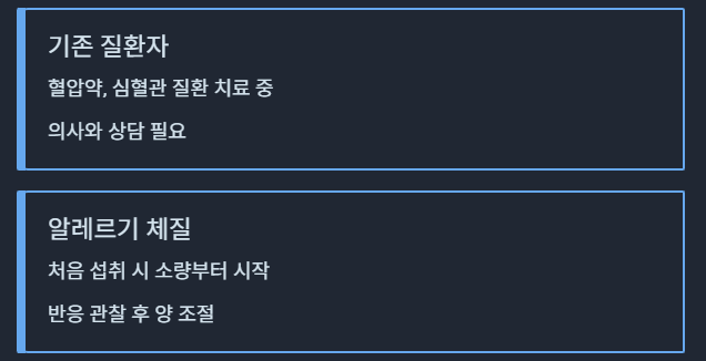 - 기존 질환: 혈압약, 심혈관 질환 환자는 전문가 상담 필요
