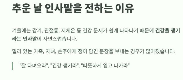 이러한 이유로 “추운 날씨 인사말”, “겨울 아침 인사”, “카톡 인사말”, “부모님 인사말” 등 키워드 검색이 유지되고 있습니다.