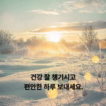 추운 겨울에는 작은 인사 한 마디가 큰 위로와 힘이 됩니다. 멀리 떨어져 있어도 문자나 이미지 카드로 따뜻한 마음을 나눌 수 있습니다. 오늘도 한파 속에서 건강 챙기시고 따뜻한 하루 되시길 바랍니다.