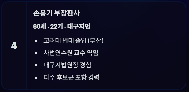 | 손봉기 | 60·22기 | 대구지법 부장판사 | 고려대 법대 / 부산 | 사법연수원 교수, 대구지법원장 역임, 과거 대법관 후보 다수 |