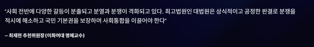 "사회 전반에 다양한 갈등이 분출되고 분열과 분쟁이 격화되고 있다. 최고법원인 대법원은 상식적이고 공정한 판결로 분쟁을 적시에 해소하고 국민 기본권을 보장하며 사회통합을 이끌어야 한다"