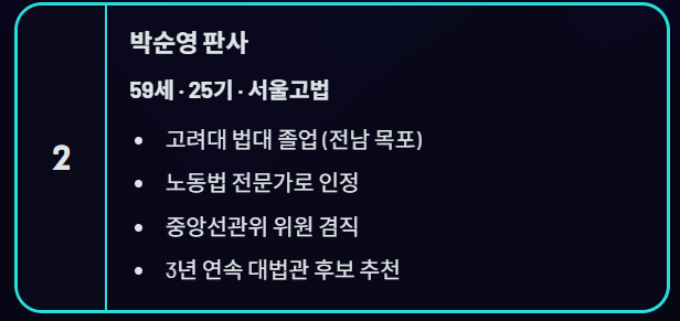 | 박순영 | 59·25기 | 서울고법 고법판사 | 고려대 법대 / 전남 목포시 | 노동법 전문가, 중앙선관위 위원 겸직, 대법관 후보 3회 선정 |