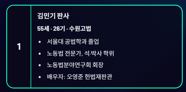 | 김민기 | 55·26기 | 수원고법 고법판사 | 서울대 공법학과 / 경기 안양시 | 노동법 전문가, 우리법연구회 출신, 배우자 오영준 헌법재판관 |