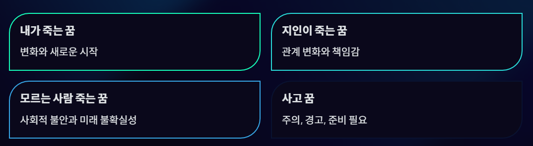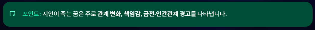🔹 포인트: 지인이 죽는 꿈은 주로 관계 변화, 책임감, 금전·인간관계 경고를 나타냅니다.