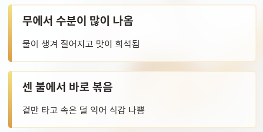 → 수분이 빠져 볶을 때 질어지지 않음