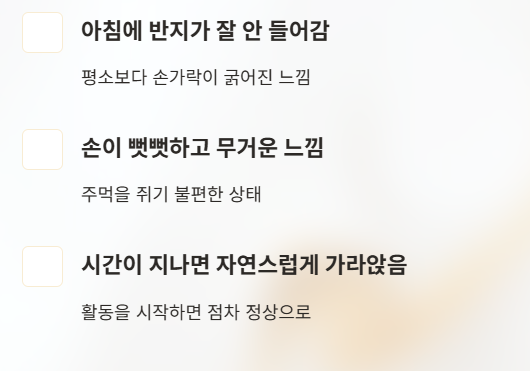 아침에 일어나면 손이 평소보다 뻣뻣하고, 반지가 잘 들어가지 않는 느낌을 받는 경우가 있다.