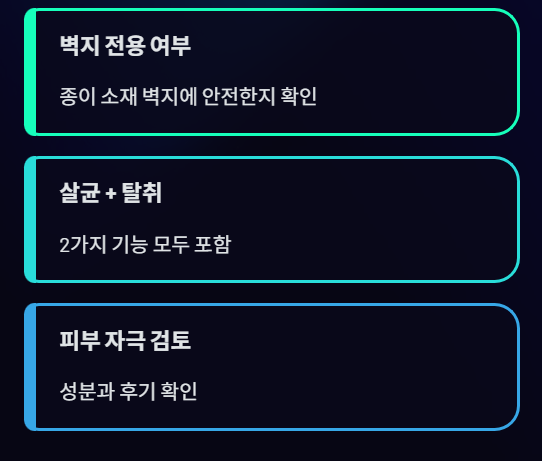 벽지는 종이 소재가 많기 때문에 벽지 전용 제품인지 반드시 확인해야 합니다.