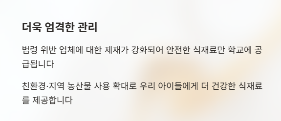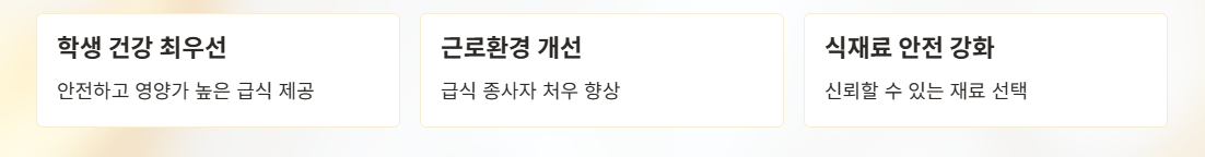 - 친환경·지역 농산물 사용 확대 → 안전한 식재료 선택과 지역 농가 지원