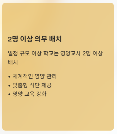 - 재학생 수가 대통령령으로 정하는 규모 이상인 학교에는 2명 이상의 영양교사 배치가 의무화됩니다.
