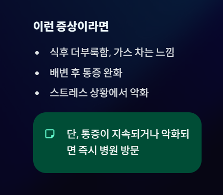 ✔ 가벼운 통증 + 배변·식사와 연관 → 생활관리 후 관찰 가능