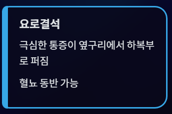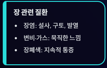- 왼쪽아랫배통증 → 대장 질환, 여성 생식기 질환 가능성 높음