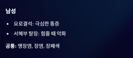 - 요로결석: 극심한 통증이 옆구리에서 하복부로 퍼지며 혈뇨 동반 가능