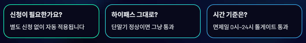 명절마다 시행되는 제도이지만, 정확한 면제 기간·적용 방식·하이패스 이용 방법을 헷갈리는 경우가 많아 출발 전 미리 확인하는 것이 중요하다.