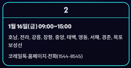 | 1월 16일(금) | 09:00 ~ 15:00 | 코레일톡·홈페이지·전화(1544-8545) | 호남, 전라, 강릉, 장항, 중앙, 태백, 영동, 서해, 경춘, 목포보성선 |