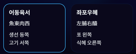 - 어동육서 → 생선 동쪽, 고기 서쪽