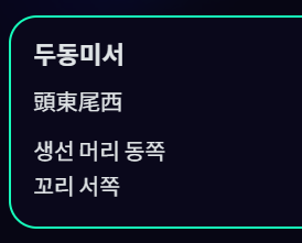 - 두동미서 → 생선 머리 동쪽, 꼬리 서쪽