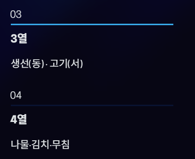 [ 3열 ] 생선(동쪽) · 고기(서쪽)