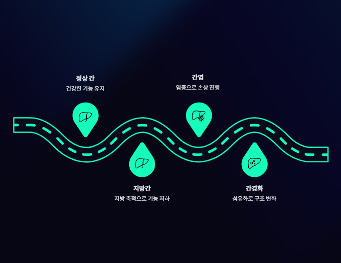 정상 간 → 지방간 → 간염 → 간경화 → 간암